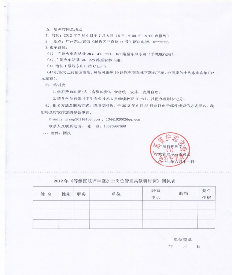 · 上一篇文章:关于广东省老年专科学组活动的通知 · 下一篇文章:关于举办 2012 年度广东省高级护理实践大会暨医院评审护理质量管理及评价指标学习培训班的通知